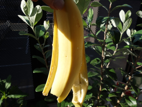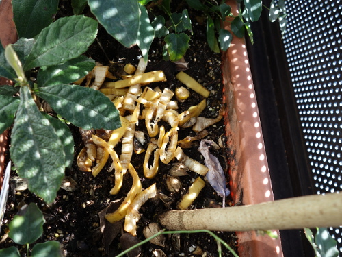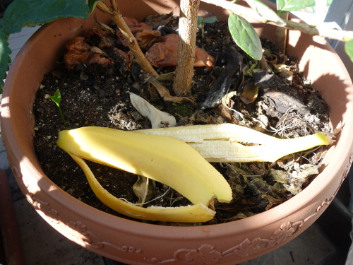 バナナの皮は植物の三大栄養素の窒素N、リンP、カリKのうち、Kを豊富に含んでいます。バナナの皮は捨てずに、キッチンバサミで細かく刻んでプランターの土の上に置いておけば肥料になります。養分を循環させます。