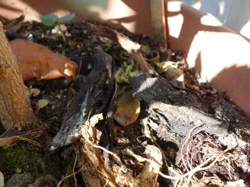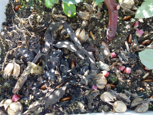 2ヶ月後には黒くなっています。隣りには枯れてしまったサラダ菜の葉っぱも置いていました。