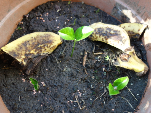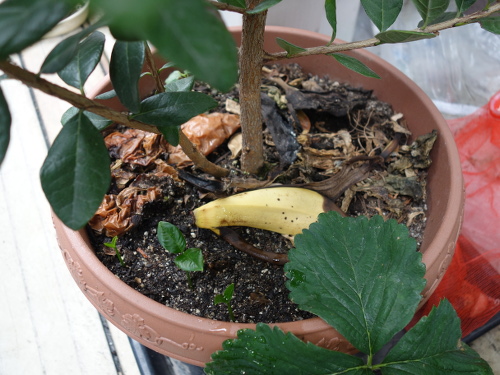 バナナの皮を捨てずにフェイジョアの鉢の中に置きました。
