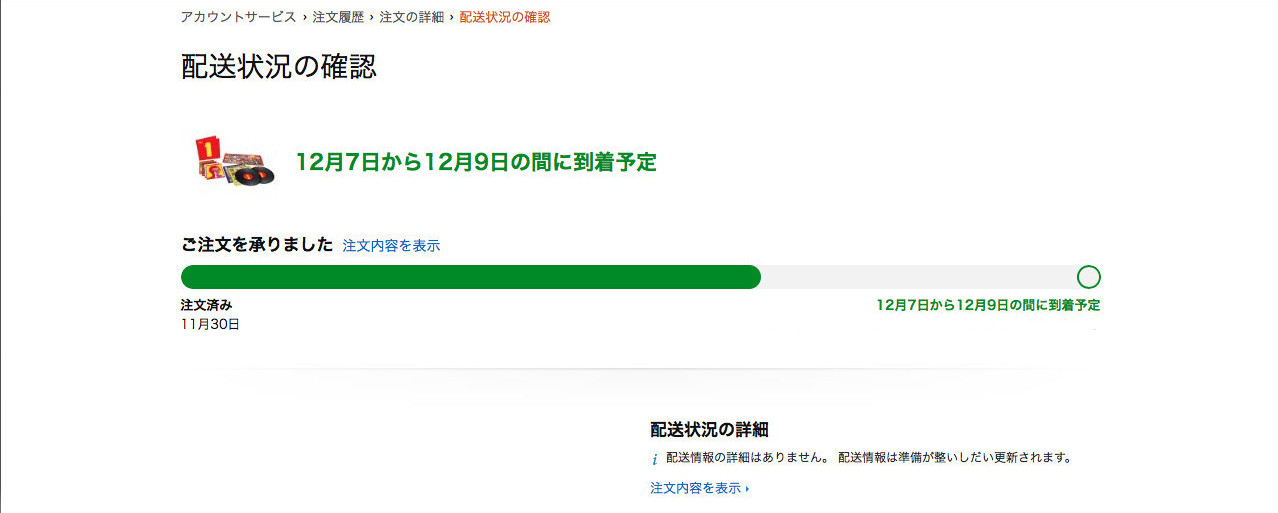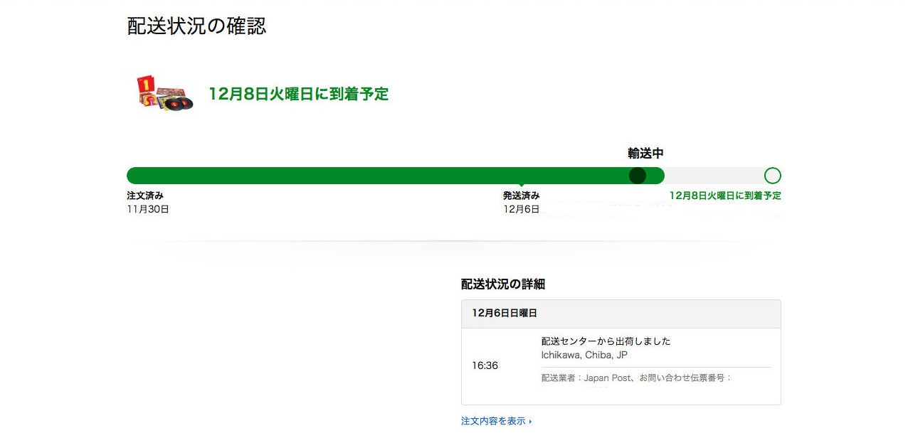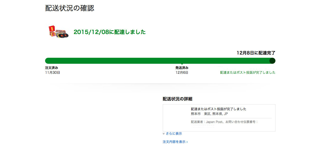 webの画面上で配達状況を見た時に、午前中はずっと「輸送中」という表示でしたが、12:20頃に郵便屋さんがLPレコードを届けてくれました。そのあと画面を確認したところ、14:17時点でまだ「輸送中」でした。画面の表示より配達の方が早かったようです。LPレコードは12月8日朝には郵便局に届いていたことになります。18:32時点では配達完了となっていました。
