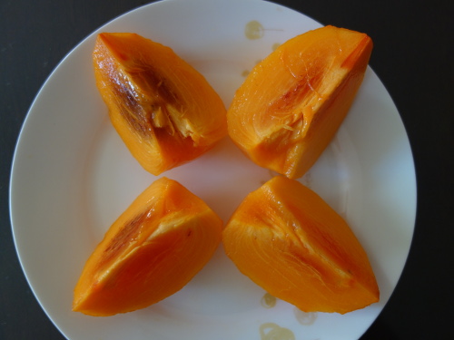 小さい柿ほど種が少ない傾向にあります。この柿は今回持ち帰った5個の中では最も小さい柿です。小さいから追熟も早かったということではありません。この柿には種は1個しか入っていなかったこともあり、ゴマも少なかったです。しかし渋味はほとんどなく、とても甘かったです。見た目や食感はマンゴーに少し似ていますが、味は絶品で太秋柿よりも甘いと感じました。
