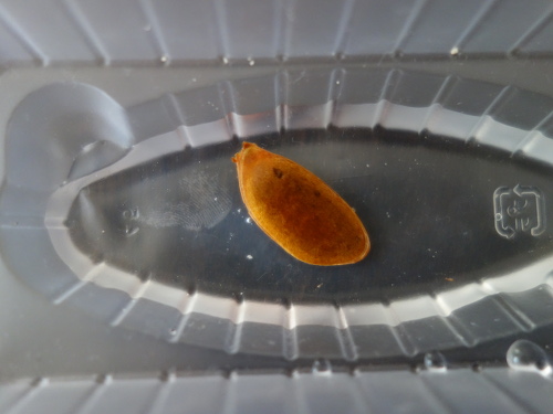 ゴマがたくさんあった部分に種が1個だけ入っていました。水に浸けています。この柿は5個の中では最も小さな柿なので、種1個も不思議ではありません。種はプランターに蒔きました。