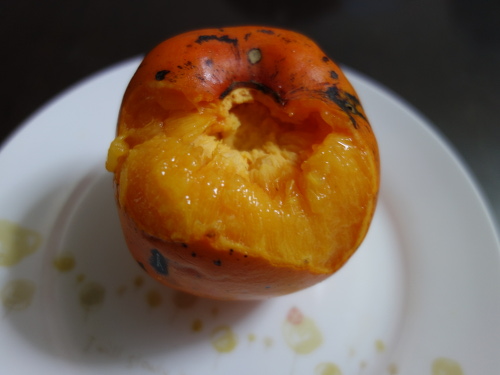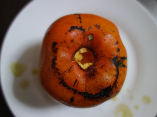 果梗と萼の部分を抜き取りました。富有柿のように割れて黒くなったりはしていません。