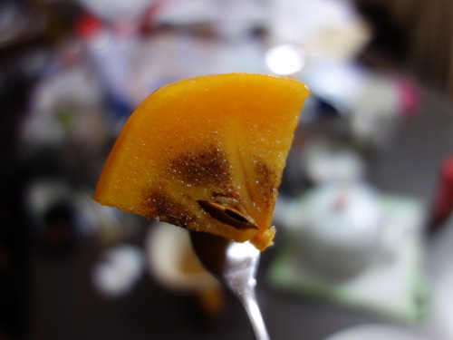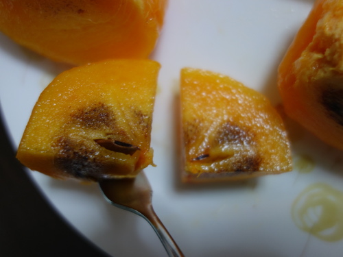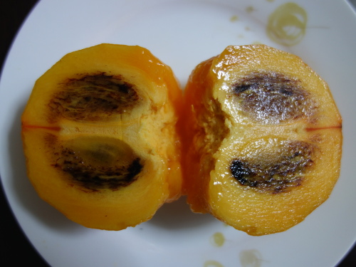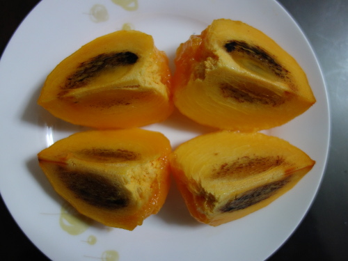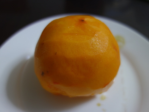 1個目とこの2個目を比べて、包丁で皮を剝いて観察しながら食べました。果実はまあまあ大きかったにもかかわらず、種は2個しか入っていませんでした。220gの1個目同様、太秋柿より甘かったです(個人的感想)。味は1個目とほとんど変わりませんが、食感も含めるとこの2個目の方がより美味しく感じました。