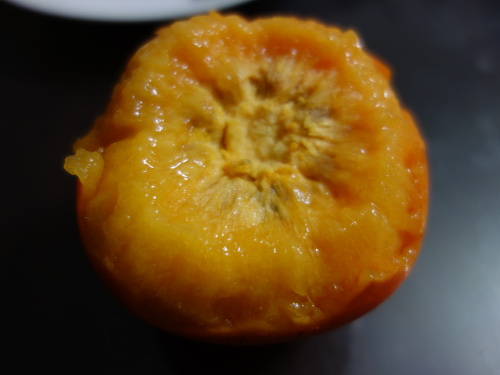 2個目(290g)の柿は果肉の中のゴマの局所濃度は高く、黒っぽくなっていたのですが、この3個目(295g)の方が全体的なゴマの量は多いと感じます。種がNo.2より2個多い4個入っていたことと矛盾しません。食べてみると、この3個目の柿は1個目、2個目と同じくとても甘くて美味しかったです。でも、あえて順番を付けるなら、