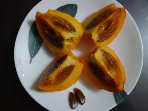 この柿にはゴマがたくさん入っていました。また、種は食べる前に撮り出した2個と、食べる時に出てきた種がさらに2個、合計4個ありました。種はプランターに蒔きました。