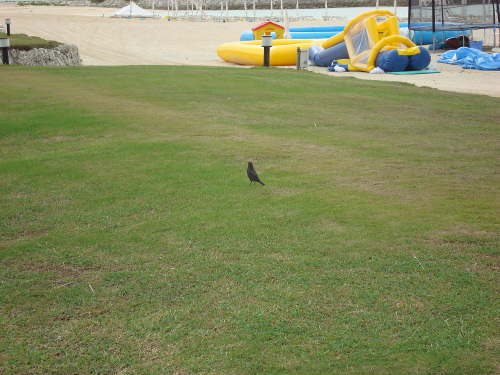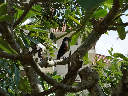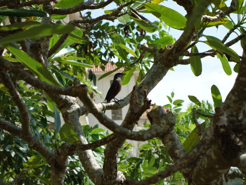 ブセナテラスのプールサイドのプルメリアの木に止まっていた雄のイソヒヨドリ