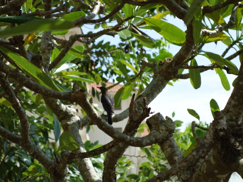 ザ・ブセナテラスのプールサイドのプルメリアの木に止まった雄のイソヒヨドリ。けっこう近くに来ました。14:32撮影。