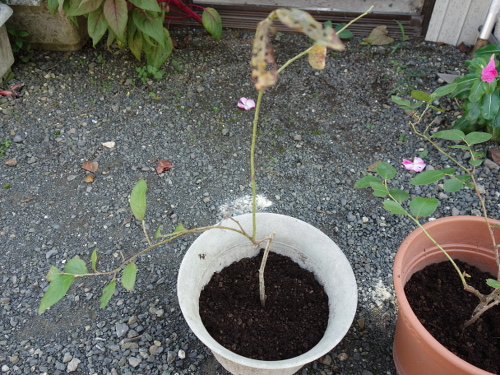枯れないまでも、生長しません。隣りのホームベルはめちゃくちゃでかくなったのに・・・。