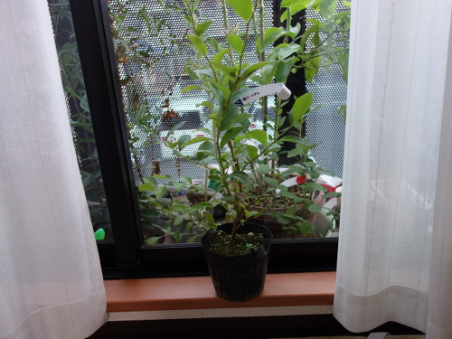 ガラス越しに撮影。日中はこのガラスに反射した光でベランダが焼けるので、苗木も葉っぱが焼けてきます。右からコースタル、マグノリア、ブル−シャワーのポリポット。