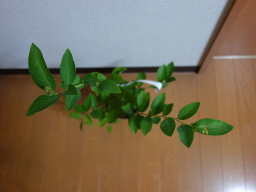 ブルーベリー コースタルの苗木。夕方、室内で撮影。