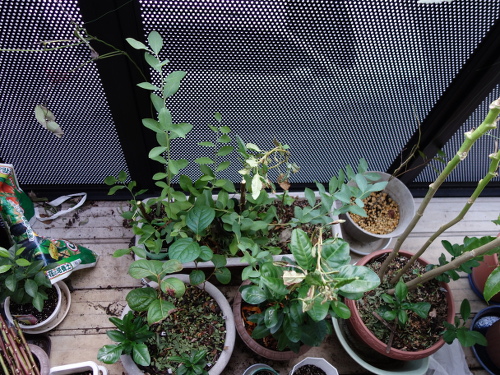 グロリアには花芽が付いています(左上はコースタル)。パウダーブルーとコースタルよりは生長しているようです。最も生長しているのはブルーシャワーです。