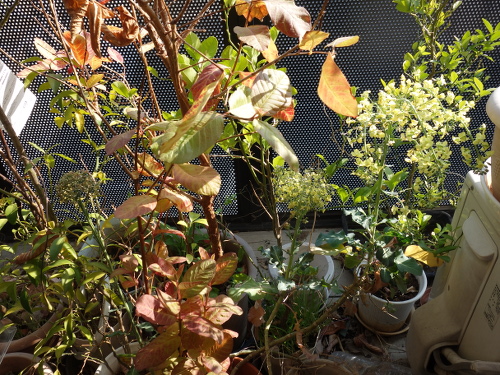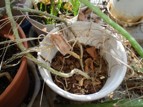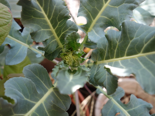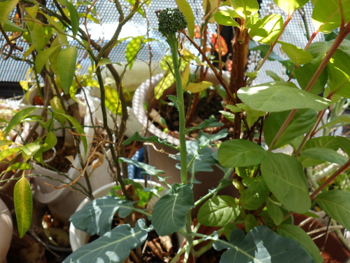 種から育てているブロッコリーが2018年の冬にとても貧弱な花を咲かせました。その時に出来た種が周辺の鉢に落ちて発芽しました。軒下でそのまま放置したところ、3年生きています。そして茎3本の先端にそれぞれ1個ずつ小さい蕾を付けています。食べるにしては一口サイズなので、そのまま花を咲かせて種をとることにしました。