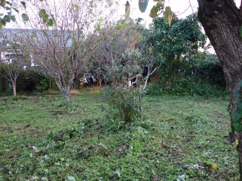 プラムソルダムと花嫁桃が植えてあった場所の中間地点に穴を掘って植えました。