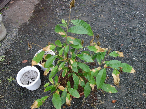 2014年6月8日(日)、2013年の秋に木の上に生っていることが確認できていたとげなし栗の実が、いつの間にかなくなっていましたが、地面に落ちていて、そこから芽が出ていました。残念ながら草刈り機で上を刈られてしまっていますが、栗の実から養分をもらって芽が育って根が張っている様子が、掘り起こした根からわかります。これを植木鉢に植えました。これから梅雨で雨が降るので、あまり土は乾かずに済むと思います。枯れるかもしれませんが、根付くことを期待しています。市販の苗はほとんど接ぎ木ですので、種から育った苗は珍しいと思います。ただ、種から育てた場合は突然変異のために同じ物はできないかもしれませんが、それはそれで結果が楽しみです。1ヶ月後に確認します。2014年7月12日(土)、1ヶ月後、芽が出ていました。とげなし栗から出た芽です。珍しいので、育ててみたいと思います。