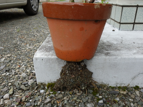 けっこう根が張っていて、鉢の下の穴から出て来て、地面に入り込んでいました。