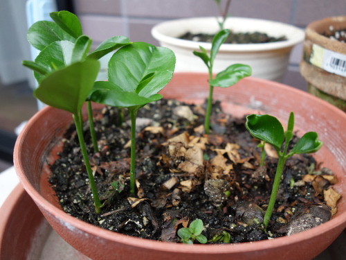 このあと、これらをどうするか思案中です。実生ですので、同じ実は生らないし、突然変異でもっとよい実が生る確率も低いし・・・。今後も育てるのはせいぜい2〜3本あればいいです。今回の実験でわかったのは、晩白柚は発芽率がとても高いということです。