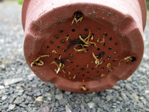 はさみで切り刻んで土の上に置きました。土に帰します。この日、ふじの実生は全部処分しました。半分は刻んでカクテルパープルの鉢に置きました。