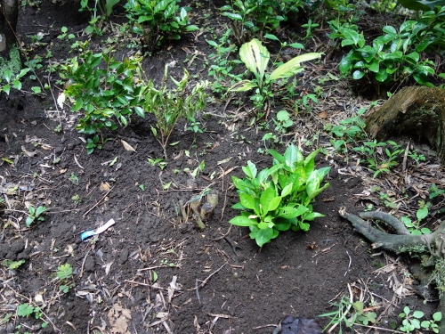 エビネ(上)と生姜(左上の榊の木を立ててあるところ2ヶ所)の近くです。