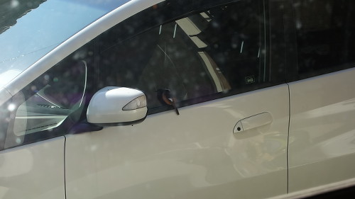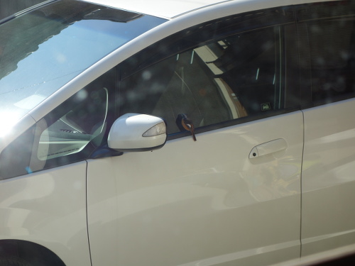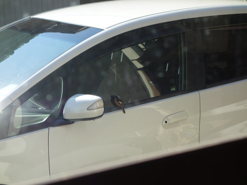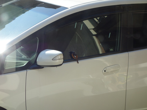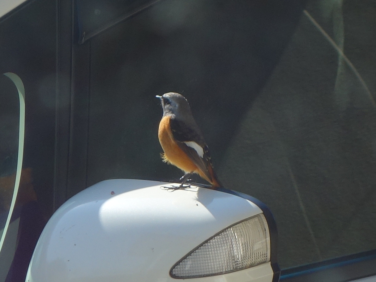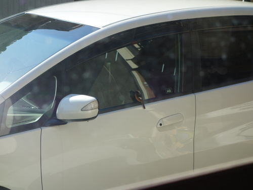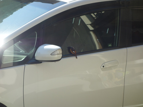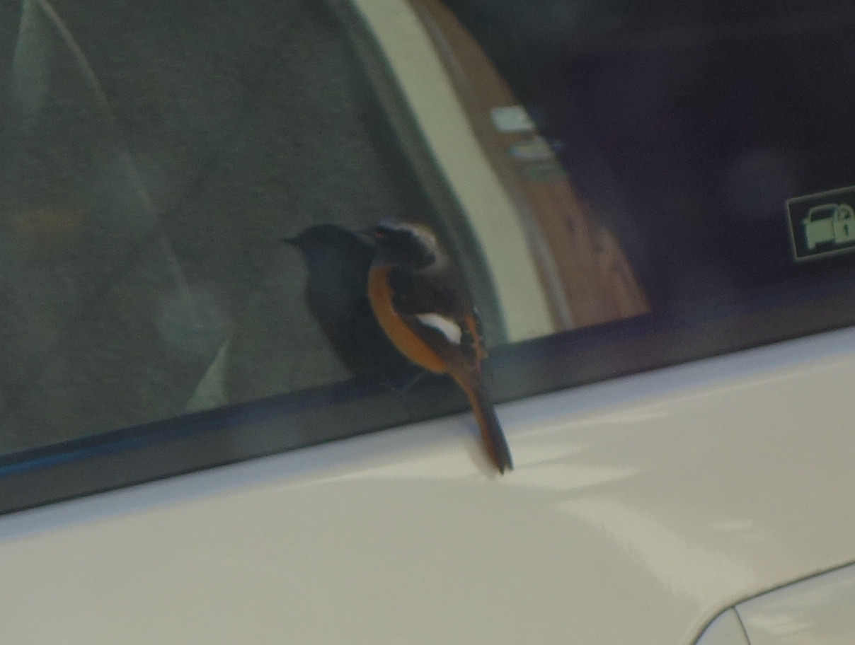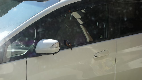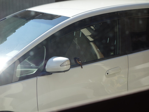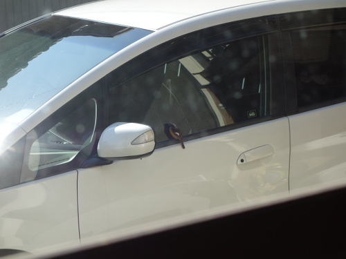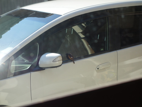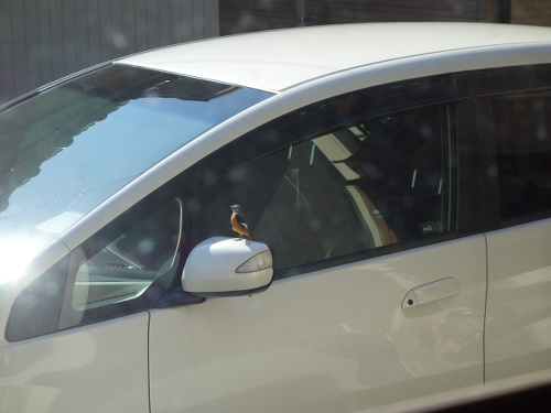 このジョウビタキ、車のガラスで自分の姿を仲間と思っていたのかもしれません。車のガラスに映っているのは自分なのに、さすがにそれはわからないでしょう。背後の家の中からガラス越しにデジカメを通して見ている私の気配にも気付いていたのかもしれませんが、もし窓が開いていたらすぐに気付いて逃げていたでしょう。一度は飛び去ろうとしてサイドミラーに飛び移ったのですが、また戻りました。やはり興味があったのでしょう。結局3分ほど滞在して飛び去りました。私が見ていなかったらもっと長くいたかもしれません。ちなみに飛び去ったあとには糞が残っていました。これで運(うん)がつきました。