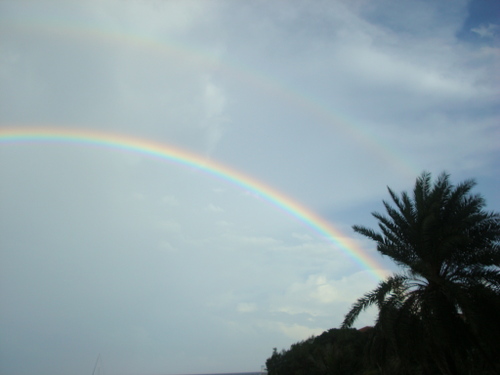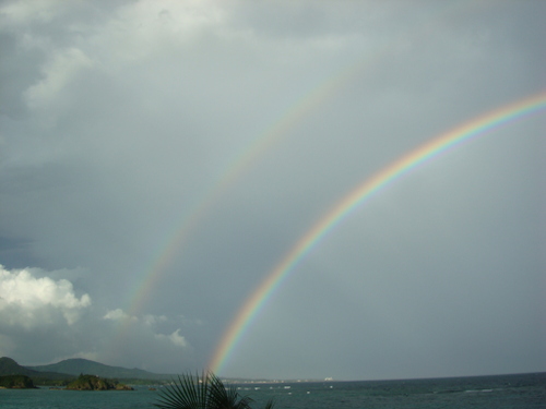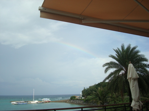 ただ、悔やまれたことが1つあります。私は沖縄にデジカメを2台持ってきていたのですが、朝食に持って行った方はたまたま性能の劣る古い方だったことです。もう1台の方で撮っていたらもっと綺麗な写真だっただろうことは間違いありません。その点は運がなかったと思いました。まさか食事中に二重の虹が現れるなんて予想できませんからね。でも、ラ・ティーダにいた客の中で、最初に気付いて写真を撮り出したのが私だったのは事実です。私自身がいろいろなことに気付く傾向がありますが、それがラッキーなことなのであればそれに越したことはないので、わざわざネガティブに捉える必要もなく、そういうことにしておきましょう。そのあと、間もなく続々とみんなテラスに出て記念撮影を始めました。