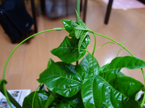 曲がっている方向から判断すると、太陽に向いていたというより壁から遠ざかりたいという"意志"を感じます。一見萎れているようにも見えましたが、葉っぱには光沢があって水が足りていない感じはありませんでした。その証拠に、水を与えていないのに夜には蔓の先端が上を向いて復活していました。よって、水切れで萎れていたわけではありません。