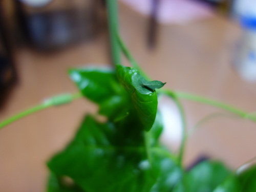 朝になっていつもの場所に戻しました。昨日はこんな感じで置いていたわけです。壁が熱くなってきて耐えきれずに逃げたのがわかります。葉っぱの先端が壁に接しています。