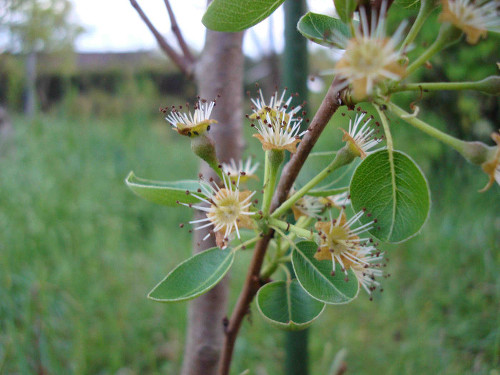 ラ・フランスは、フランス原産の洋なしです。食感はモモや柔らかいリンゴにも似ています。日本へは当初は食用としてではなく、受粉用として導入されました。だからですね。花がたくさん咲きます。収穫は実の固いうちに行われ収穫後に常温で追熟して生食できるようになる。追熟の間、果実に含まれる多糖類のデンプンが分解されて果糖、ショ糖、ブドウ糖などの糖となる。これにより甘味が増し、増粘剤として知られるペクチンのゲル化により舌触りの滑らかさが増します。木に生っているときに枝に近い部分が褐色を帯びてくると柔らかくなり、それから1日程度が完熟の目安であるとのことです。