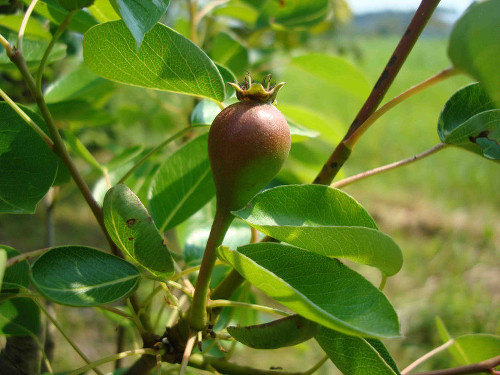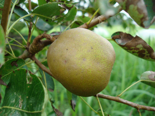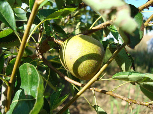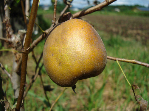 2013年9月21日(土)、落ちる寸前でした。実と枝をつないでいる部分がすでに枯れていたように感じました。ラ・フランスは収穫後すぐには食べられず、収穫した後、 予冷とその後の追熟により、肉質、香りを高めるそうですが、今回はもう食べました。やはり追熟しないとだめですね。あまり甘くありませんでした。来年に期待します。