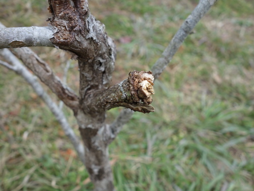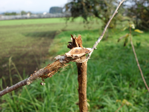 枝が折れていました。テッポウムシに侵されて空洞が出来ていたためです。無農薬でやっているので仕方ありません。