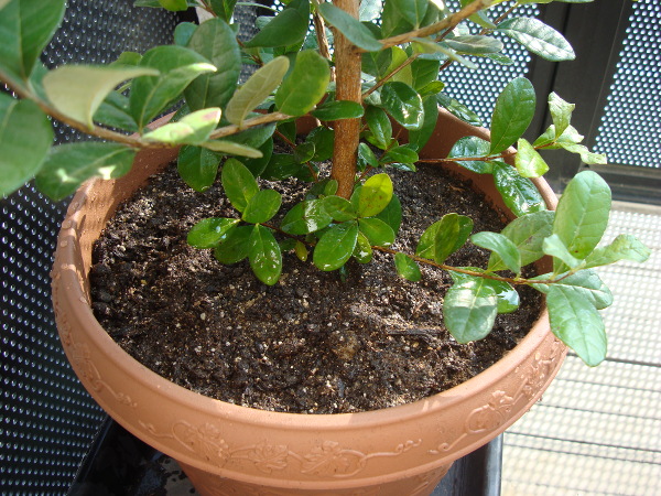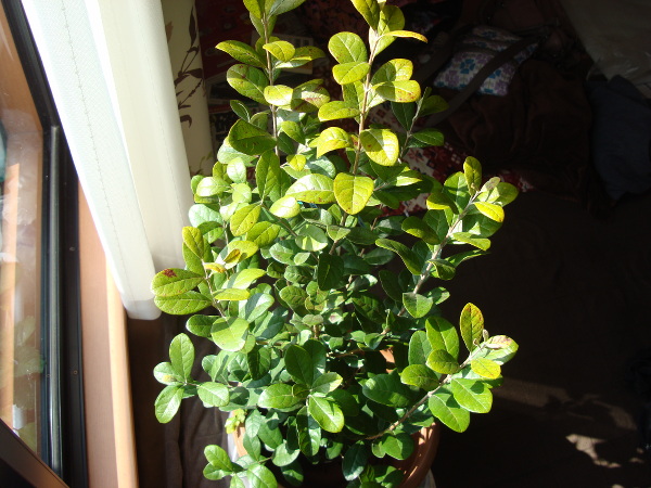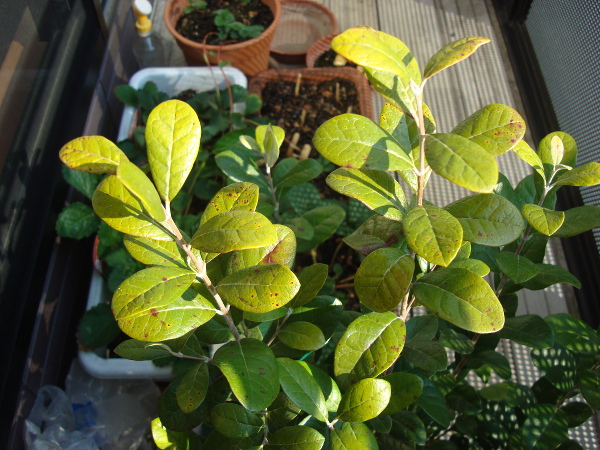太陽光を浴びて黄緑色をしています。寒さのためか褐色の斑点が入っているのがわかります。この点はグァバの苗木とよく似ています。