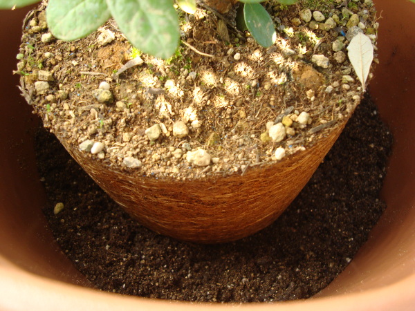 買ってきた鉢にイチゴの葉っぱなどを少し敷いてから、土を少し入れました。