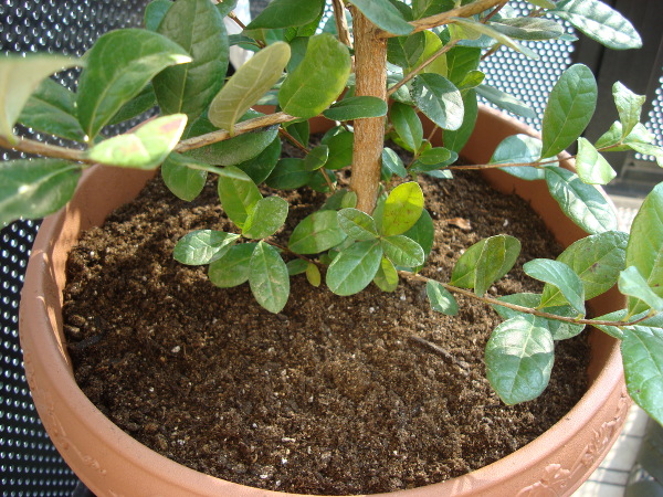 土の上に置きました。土の上の斑点はベランダの金網の穴から入射した太陽光です。