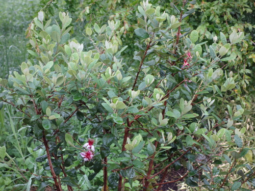 フェイジョアの果実は熟すと自然落果します。その点はマンゴーと同じです。落果してすぐには硬くて食べられませんので、キウイのように、収穫後追熟させてから食べます。追熟できたものはバナナやパイナップルのような独特の強い香りがして、甘いといわれています。早く自分で確認してみたいものです。生食またはジャムやゼリーなどの加工食品、果実酒などに利用できるので、個人的には果実酒に興味があります。しかし、異品種を混食しないと実が生らないそうです。木自体は接ぎ木、挿し木で殖やすことができます。挿木で殖やせるか試してみたいと思います。また、強い剪定を行うと翌年の開花、結実量が悪化するともいわれています。私はあまり剪定しないので好都合です。庭木としても興味があります。