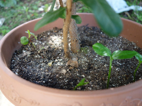 フェイジョアの脇に植えてある河内晩柑の苗3本とハイビスカスカクテルパープルの苗1本。