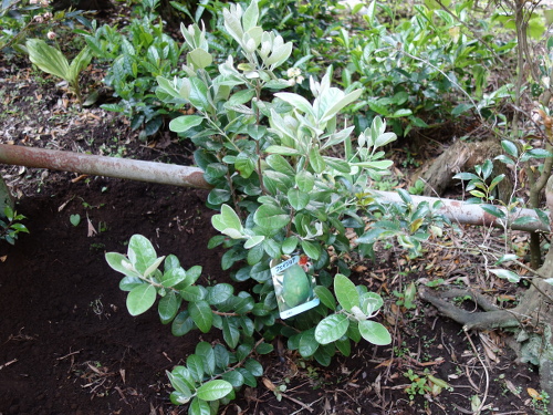 2015年1月12日(月)、近くのホームセンターでフェイジョアという珍しい果樹の苗木を見つけました。パイナップルグァバともいいます。写真は一瞬アボカドかと思ったのですが、違いました。花の写真がついていましたが、それを見るとイエローストロベリーグァバの花にそっくりでした(色はイエローストロベリーグァバの花は白ですが、形がそっくりです)。寒さに弱いので、鉢植えにして、冬は室内で育てると書いてありました。その点もグァバの場合と同じです。面白そうだと思い、さっそく買って帰りました。鉢を1個と、土も一袋買って帰りました。ただ、タグには品種が書いてありませんでした。異品種を混植しないと実が生らない品種もあるので、2本以上植えるべきなのですが、1本しかありません。仕方ないのでこのままいきますが、4〜6年後に自家結実性があるならばアポロかクーリッジあたりに絞られると思います。