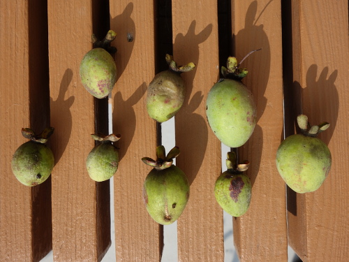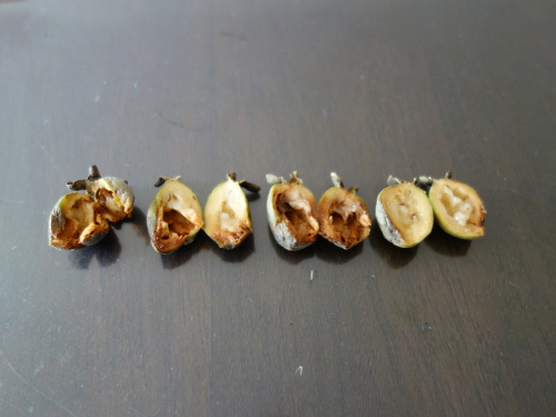 上段左の1個が1枚前の写真の左端の1個。上段右の1個が1枚前の写真の左端から2個目の果実。下段左の1個が1枚前の写真の左端から3個。下段右の1個が1枚前の写真の右端の1個。