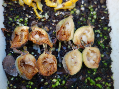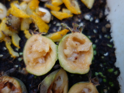 腐りかけたフェイジョアの果実8個のうち、上段左から2個目の腐りかけの1個はビルベリーの鉢に種を蒔きました。