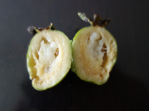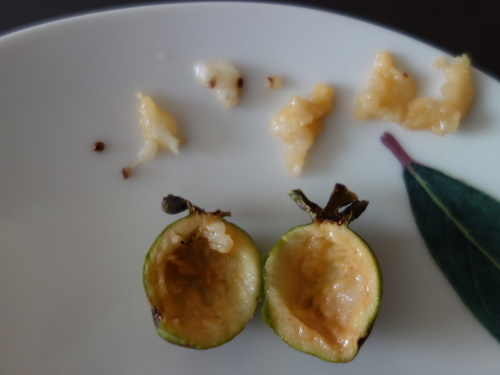 前述の4個のほかにさらに2個、合計6個を使うことにしました。まず5個目は1枚目の写真の中のいちばん下の1個のフェイジョアの果実です。