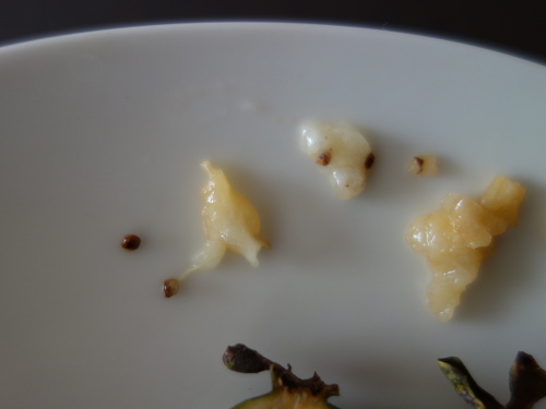 包丁の先で中身を皿の上に出してみました。種は4個確認できました。