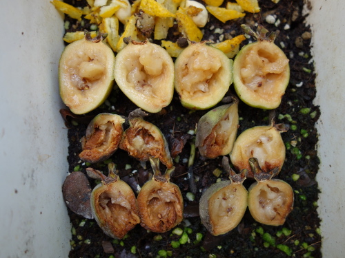 しかし、私は果肉ごと種を蒔きました。果肉はしだいに腐っていくので、発芽抑制物質もなくなっていきます。一般的には種に付着した果肉と発芽抑制物質を洗い流すために種を水洗いするようですが、流そうにも種が小さくてどこかに流れていきそうだし、プランターの中でもどこに置いたかわからなくなるし、水を遣ったら流されてどこかに移動してしまいそうなので、それらを避けるためにも果肉と皮と一緒に置きました。皮の存在が種がある場所の目印にもなります。