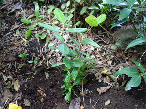 蔭になっているので細いです。しかし、近くで発芽していたスイカの芽は枯れてしまったのに、このフェイジョアは生きているので、水の取り合いにも強いといえます。