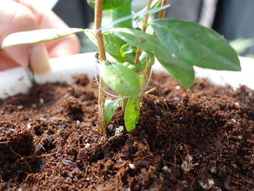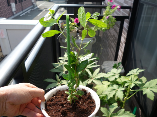 5号鉢に植え替えます。ひょろっとしていて不安定なので、棒を1本立てて、釣り糸で軽く巻いて支えます。