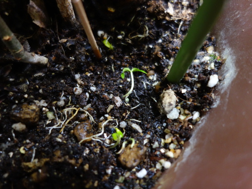 | 発芽したのはビルベリーの植えてある鉢の中。それを陶器製の鉢に移植てしばらくしたあと、一回り大きいプラスチック鉢に替えた。 | |