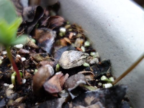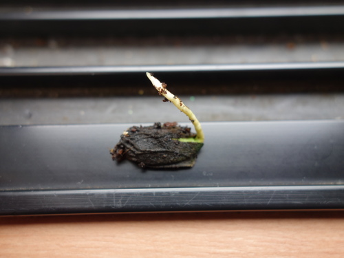 2本目の発芽したファーストクィーンの種。根が地中に埋まっていませんでした。これを土に植え直しました。