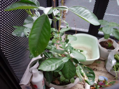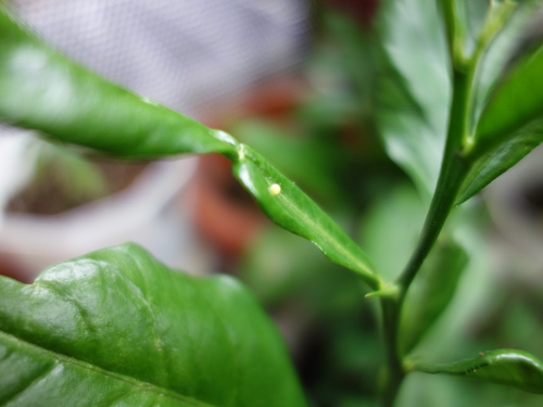 ベランダの大きな丸いプランターのファーストクィーンの実生苗にアゲハが卵を産みつけていました。オレンジ色の角を出すイモムシになるので処分しました。