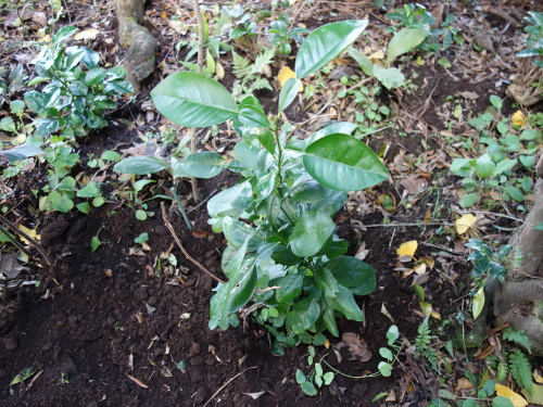 根鉢ごと裏の畑に植えました。ファーストクィーンは2本あります。左下に太秋の実生が1本あります。ほかに、アケビの実生が生えています。パッションフルーツの実生もありますが、そのうち寒さで枯れるでしょう。食べた感想としては、あくまでも個人的な感想ですが、晩白柚ほどではないにしても甘くて美味しかったです。色がきれいなので美味しく見えます。ファーストクィーンはきれいに皮を剝き、器に盛れば高級フルーツとして来客のおもてなしにも使えるし、野菜サラダの中に彩りとしても使えます。表皮の裏のスポンジ状の部分は砂糖で煮詰めると文旦漬けになり、衣を付けて天ぷらにすることもできます。果肉の丸ごと入ったクィーンゼリーにしたり、スナック菓子に果肉をピューレにして乗せたおやつにしたり、いろいろと工夫もできそうです。