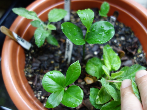 複数の鉢やプランターで10本以上発芽しました。最もきれいな実生を4本ほど示します。そのうちの1本目。