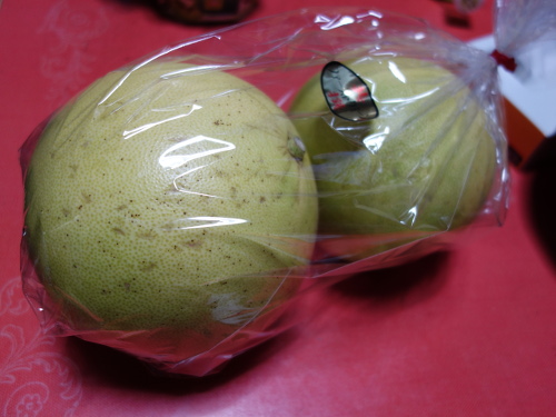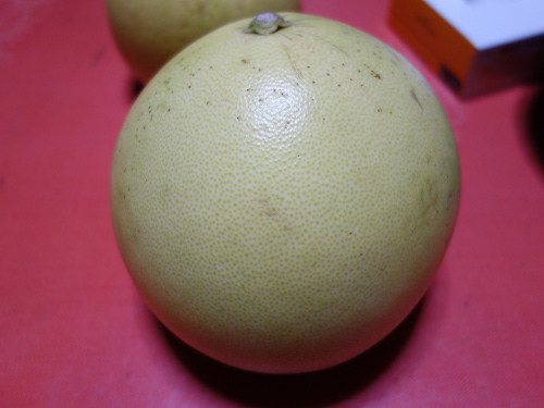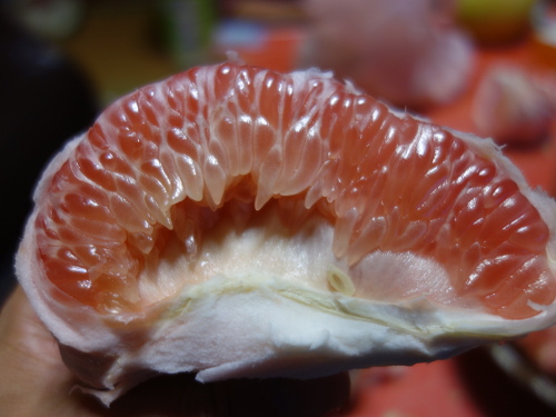 国道3号線の田ノ浦町の道の駅でファーストクィーンという晩白柚によく似た一回り小さい柑橘類を買って食べてみました。外観は晩白柚によく似ていますが、皮を剝くとスポンジ状の部分がピンク色をしていて、砂のう(砂囊)は紫色をしていました。種がたくさん入っていました。皮も料理して食べられるそうです。