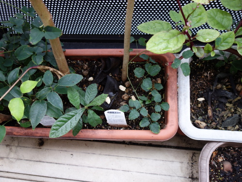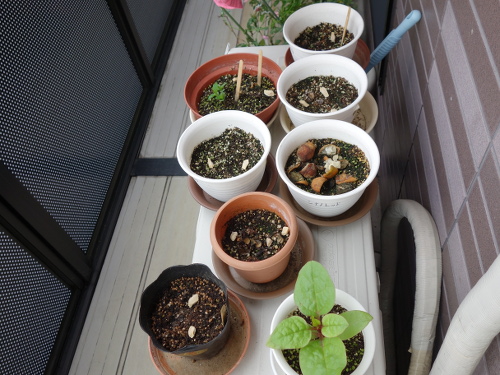 いろいろな鉢に蒔きました。これらの鉢はほとんどりんごの種を蒔いてあるので、発芽しても区別はつきます。